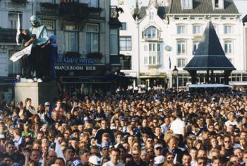 Na een leuke wedstrijd in Roosendaal tegen RBC die Fc den bosch met 1-2 won door twee doelpunten van invallerer lurling is Den Bosch kampioen van de toto divisie seizoen '98-'99 De kampioenen werden om 7 uur op het stadhuis gehuldigt door ongeveer 8000 man wat veel is voor dit voetbal team. De huldiging verliep vlekkeloos, Rotterdam eat youre hart out We hebben daarna in het Ecco stadion gefeest met de Soca boys, de Venag boys en als afsluiter Charly Lownoyse en echte bossenaar Mental Theo Het was echt geweldig! | ||||||||||||||||
